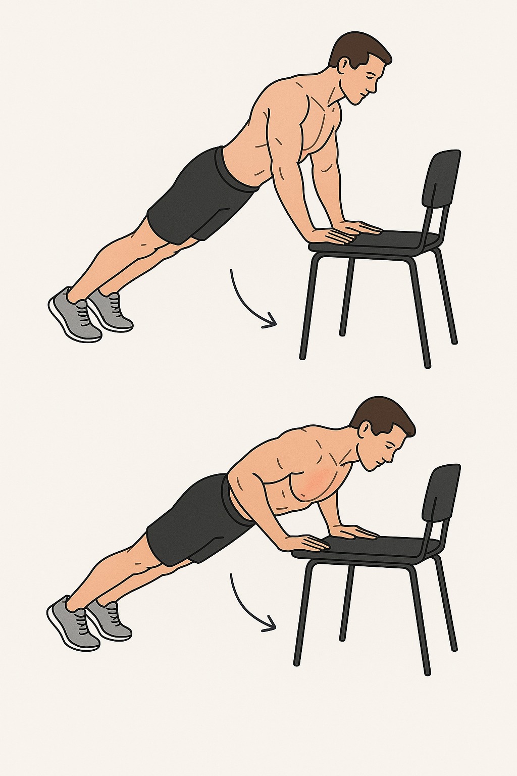 上斜伏地挺身(Incline Push-up)是徒手胸肌訓練中對肩關節與核心壓力最小的變化型,藉由將雙手放在高於地面的支撐物上(例如椅子、長凳或穩固平台),降低自體重量負荷,適合初學者或想針對胸大肌下束與核心穩定性加強的人。以下是完整詳解: