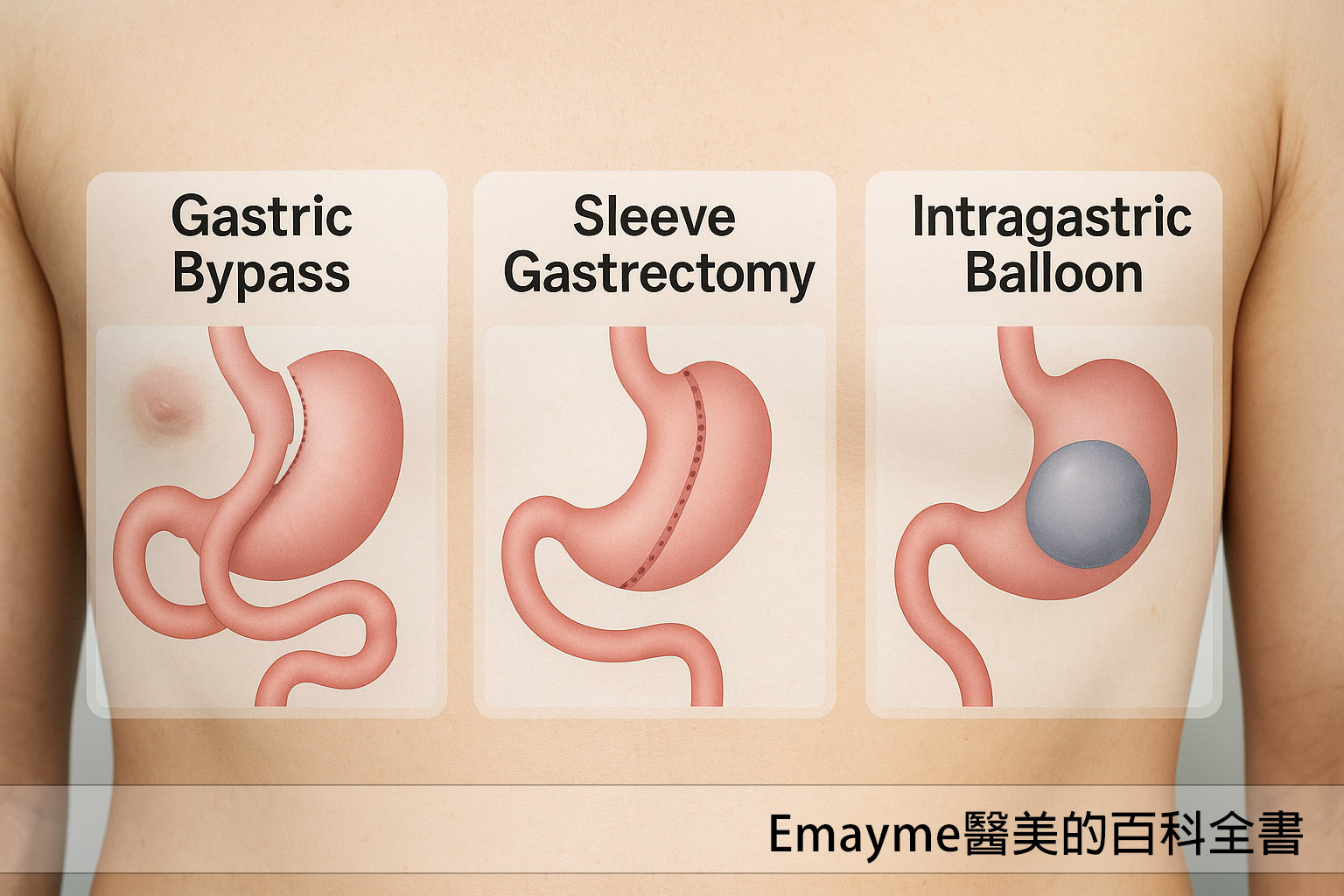 以下是目前常見的三種 醫療級減重手術或處置方式——「胃繞道手術、胃縮小手術(袖狀胃切除)、胃內水球」的詳細介紹與比較,幫助你了解適合的選項: